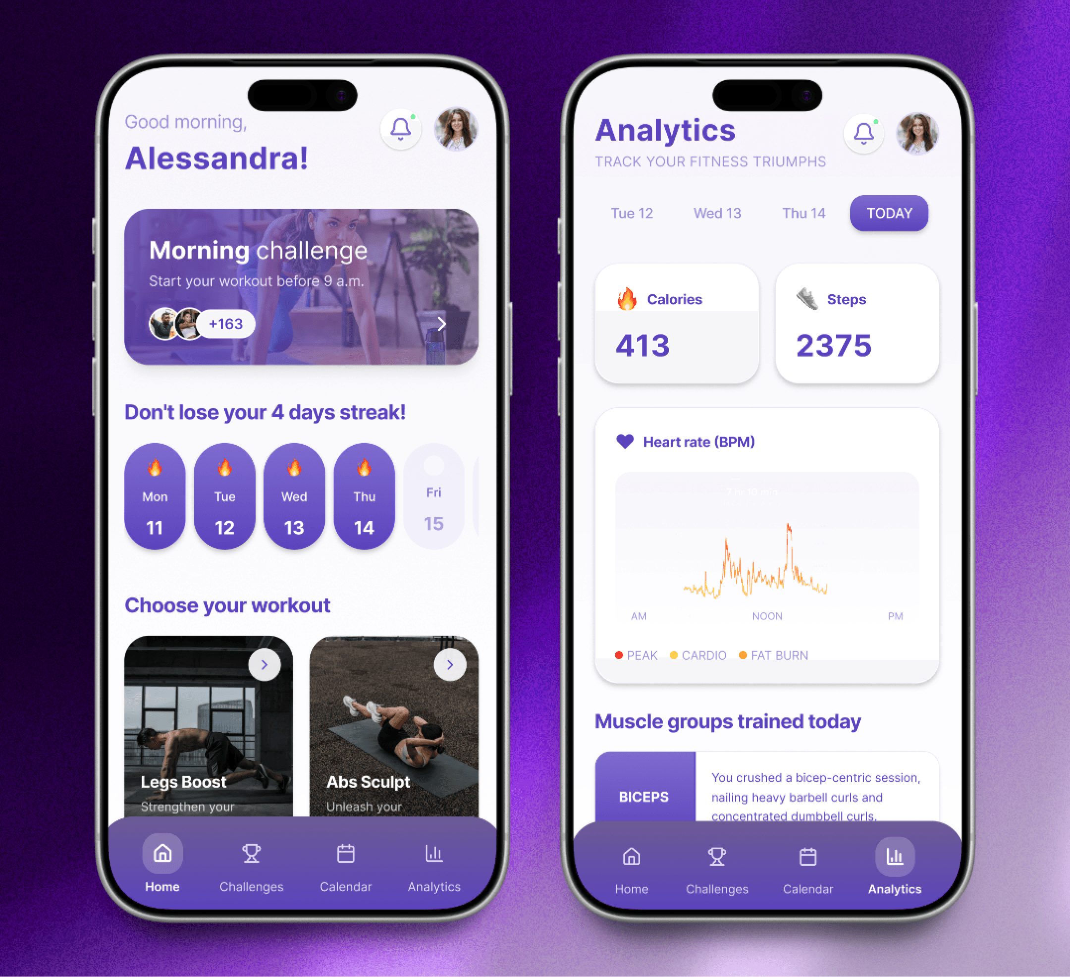 The Challenges tab provides a dedicated space for users to create, accept, and monitor fitness challenges with friends, transforming training into a shared, competitive journey. Detailed analytics offer clear insights into performance, including calories burned, steps taken, heart rate trends, and muscle groups trained. Together, these features combine social motivation with measurable progress, creating an engaging and results-focused training experience.