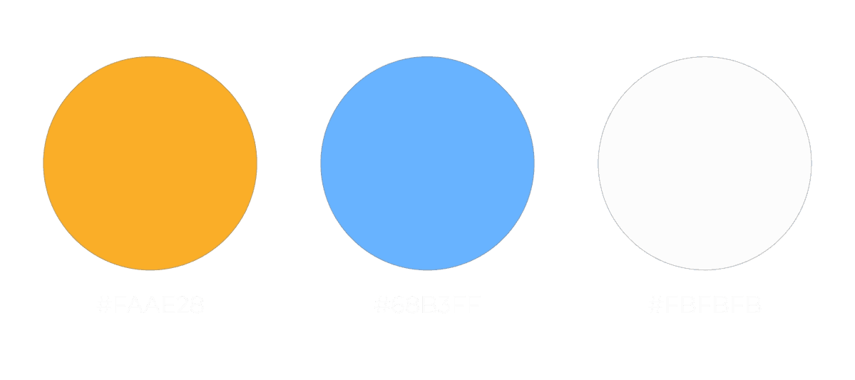 The color palette includes yellow (FAAE28), light blue (68B3FF) and white (FBFBFB). The yellow adds a cheerful and energetic feel, while the light blue brings a calming, friendly tone. White provides contrast and balance, ensuring the colors complement each other well and create a harmonious, modern aesthetic. This combination is playful yet professional, reflecting the brand's fun and approachable nature.